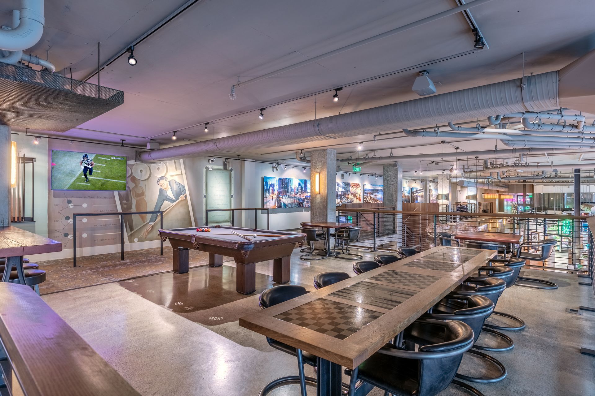 A stylish resident lounge featuring blue walls, comfortable seating, and a spacious bar for socializing.
